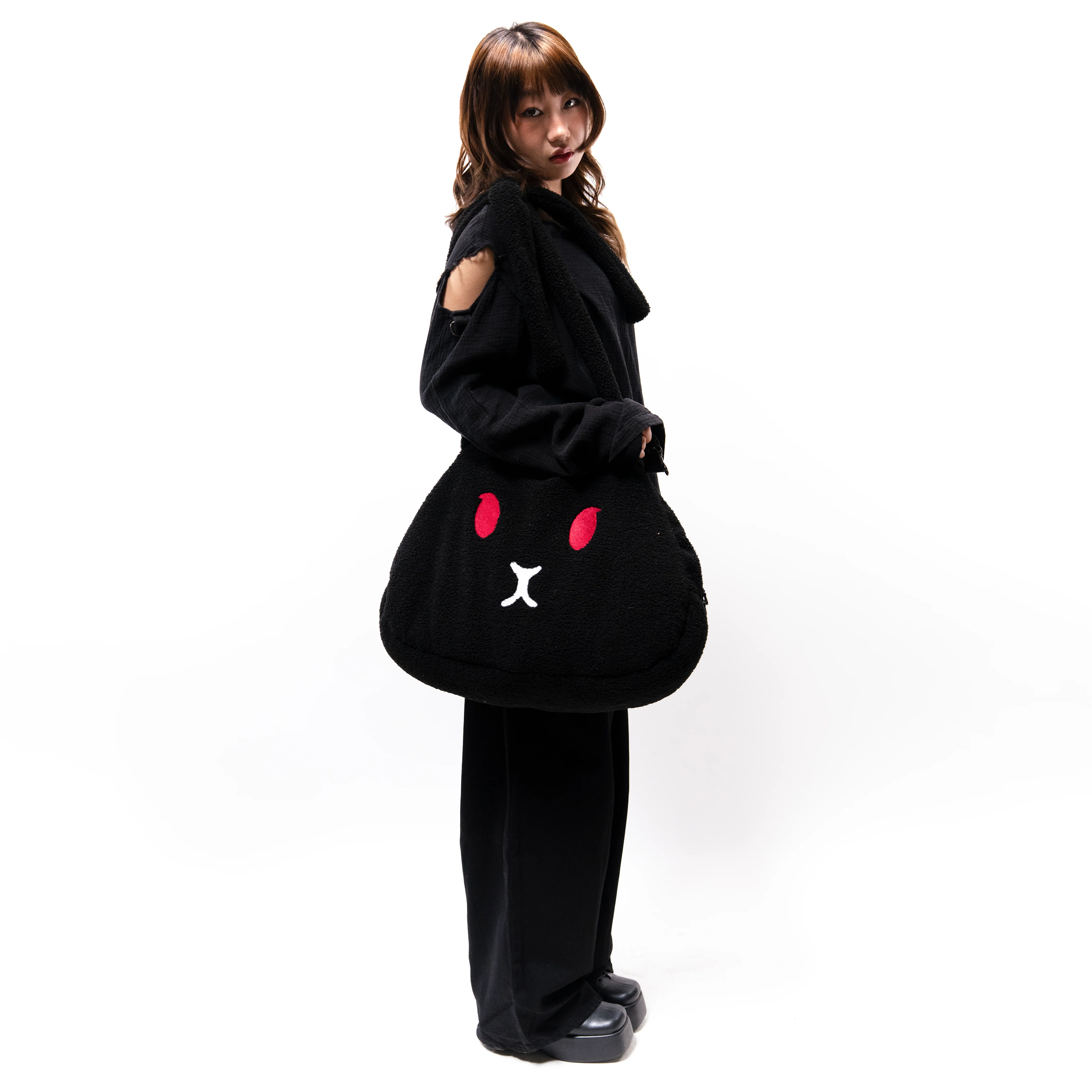 A large bag shaped like a bunny face. The straps are the ears. Named after Benny. Padded interior, YKK zipper, embroidered details. Available in black and white.