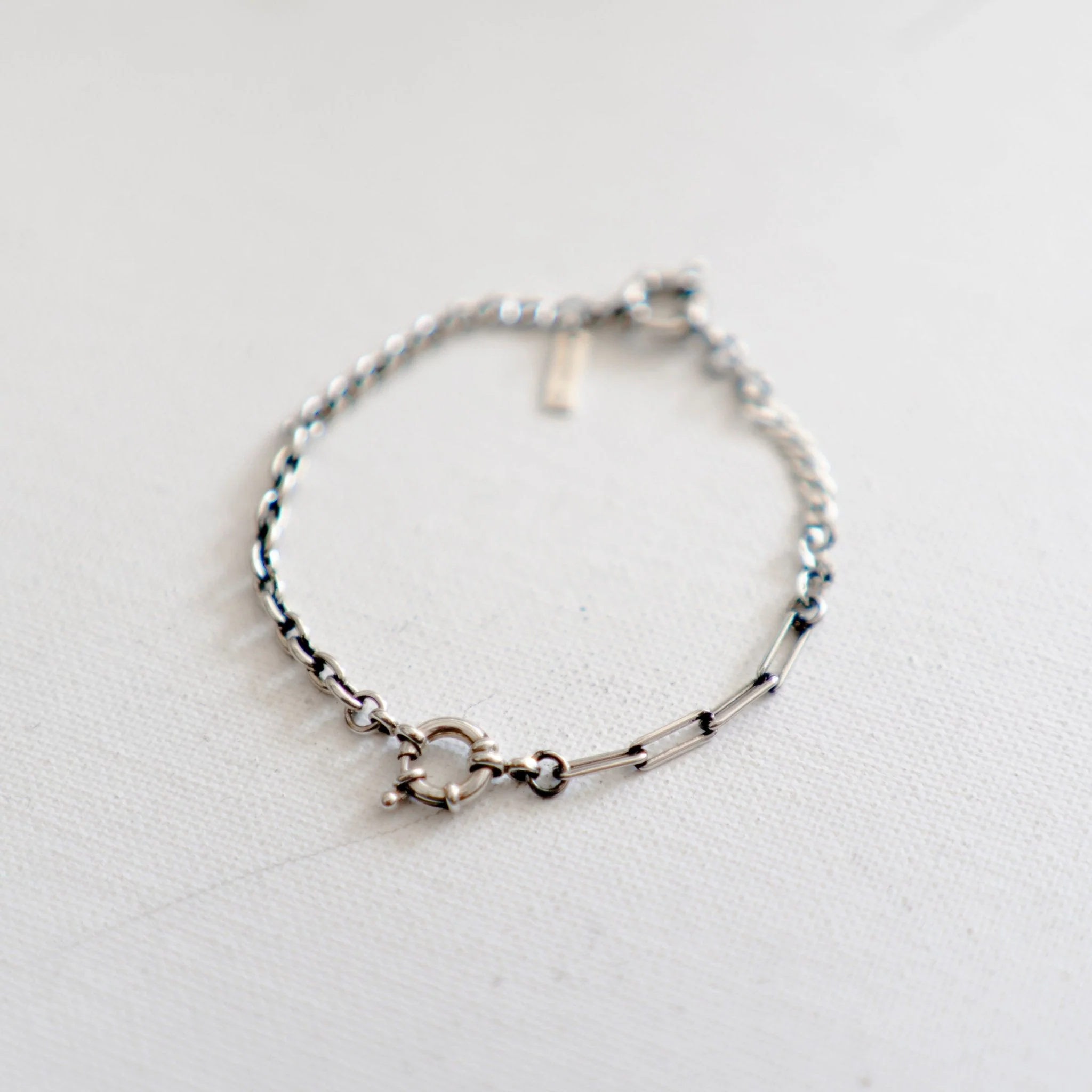 Four different chain styles combined into one bracelet, referencing the boro technique of patching and repairing fabric with whatever scraps are available. .925 sterling silver, unplated, oxidized and polished. Two spring ring closures allow the bracelet to be opened and charms added.