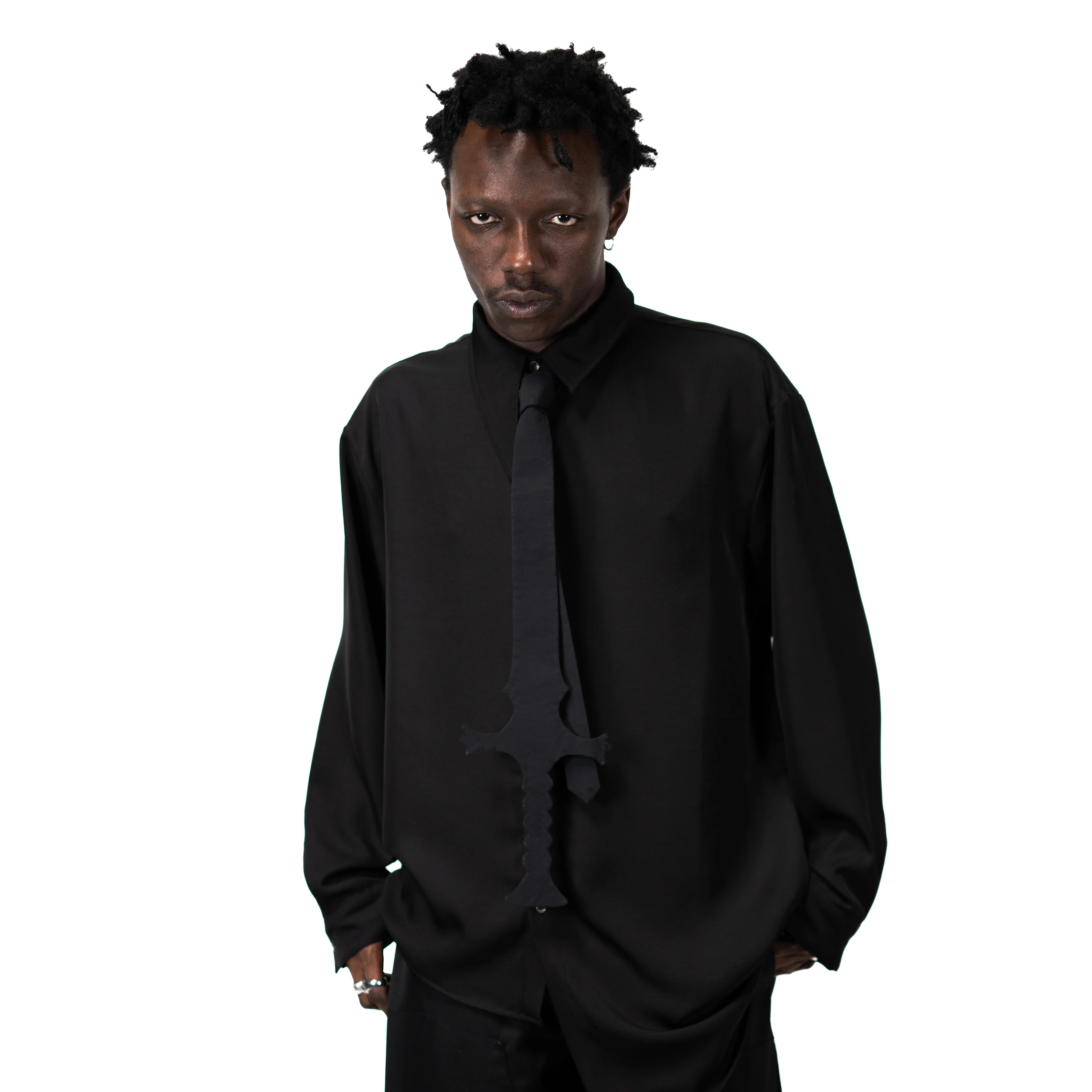 100% wool necktie featuring a sword-hilt motif drawn in-house and translated into a woven pattern. Designed with a fairly traditional length and structure, with a sculpted blade-inspired shape and keeper loop detail. The motif is woven into the fabric itself. Not printed, not embroidered.